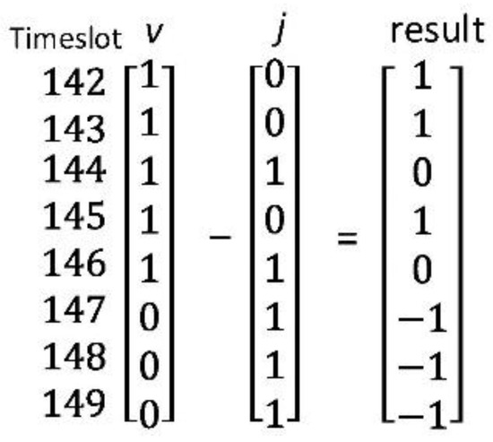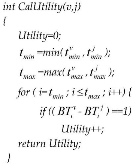 At every service time slot, each RSU repeatedly generates and broadcasts SLNC-coded content pieces to all nodes that can receive its wireless signals. SocialCode proposes to adopt one bit in the content bitmap to indicate whether a node has received a specific SLNC-coded piece broadcast by the RSU at a service time slot. In Figure 3, if nodes v and j have received SLNC-coded content pieces from time slot 142 to 146 and 144 to 149, respectively, the content bitmap, that is, , of node v from timeslot 142 to 149 is specified as [1 1 1 1 1 0 0 0] and that, that is, , of node j as [0 0 1 0 1 1 1 1]. Here a bit 1 indicates that node v or j has received the content piece issued at the corresponding time slot. For calculating the utility value of node v over node j, SocialCode invokes the proposed CalUtility(v, j) function in Figure 4, where denotes the associated bit value of time slot i in the content bitmap of node v. Moreover, and indicate the starting and ending time slots in node v’s content bitmap, respectively. Hence, CalUtility(v, j) calculates the number of bits with value 1 in the difference bitmap, that is, [1 1 0 1 0 −1 −1 −1] as shown in Figure 3, of node v over j. It finally returns 3 as the utility value of node v over j to express the number of innovative content pieces that node v could forward to j in the CCD process.