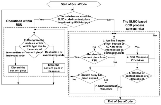 - Oppositely, if the node receives a fresh content piece broadcast by any RSU, it stops executing the SLNC-based CCD process and goes back to step 2, which recognizes itself as which type of vehicular node as described above.