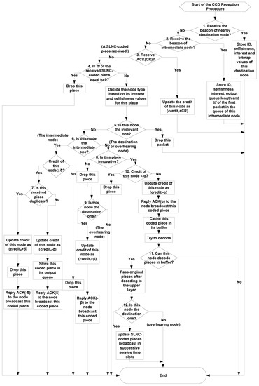 - As soon as the node receives the SLNC-coded content piece, the beacon message or the ACK packet from any nearby intermediate or destination node during this process, it will invoke the CCD reception procedure to receive decode all SLNC-coded pieces of a generation.