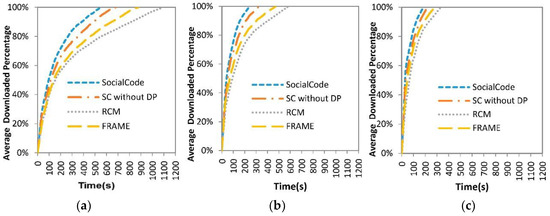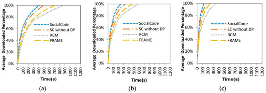 As mentioned above, when the intermediate node with RCM + CodeOn and FRAME + CodeOn receives a content piece from the destination node, it will increase its credits by one unit, which is paid by this destination one. As the intermediate node with SocialCode and its variety receives a non-duplicate content piece, it has to compensate the sending node credit δ due to the guideline in Table 3. Nevertheless, whenever it further forwards its content piece, which is non-duplicate to next intermediate node or innovative to next destination node, SocialCode and SC without DP will raise its credit by δ or β, respectively, which is paid by next receiver accordingly. Hence, SocialCode and SC without DP achieve more steady values on average credits of the intermediate node than RCM + CodeOn and FRAME + CodeOn do, as shown in Figure 11. On the other hand, because SC without DP does not decide the dynamic priority of each intermediate node, the intermediate node that receives content pieces earlier has higher probability to forward its cached content pieces to nearby ones, which dissipate its credit values faster. Thus, as shown in (a–c) of Figure 11, the intermediate node of SC without DP suffers from lower and less stable average credits than that of SocialCode but its destination node owns higher average credits. Further, the larger the file is, the lower average credits the intermediate node owns but the higher ones the destination node does. Consequently, these results show that the dynamic forwarding priority assignment, proposed in Section 4.3, adopted by SocialCode achieves much fairer content piece forwarding among intermediate nodes than SC without DP does.