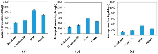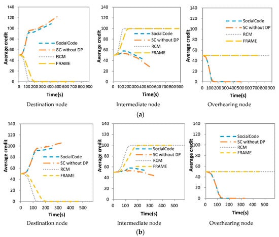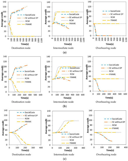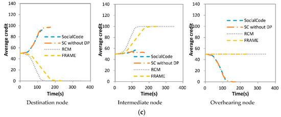 As mentioned above, when the intermediate node with RCM + CodeOn and FRAME + CodeOn receives a content piece from the destination node, this destination one will pay one unit of its credit to increase that of the receiving intermediate node. With the same reasons mentioned in Section 4.2, SocialCode and SC without DP achieve more steady values on average credits of the intermediate node than RCM + CodeOn and FRAME + CodeOn do under three different numbers of nodes, as shown in Figure 14. Further, because SocialCode assigns dynamic forwarding priorities and backoff delays of all nearby intermediate nodes with Equations (4) and (5) respectively to schedule their sequences on re-broadcasting content pieces, the intermediate node with SocialCode has higher probability to re-broadcast an innovative content piece to its successive destination node than that using SC without DP does. Hence, the average credit of the intermediate node with SocialCode decreases slower than that using SC without DP. As shown in (a–c) of Figure 14, SC without DP gives higher average credits to the destination node but lower ones to the intermediate node than SocialCode does, no matter which number of nodes is used in the simulation. Further, the larger the total number of nodes is, the less stable and lower average credits the intermediate node has but the higher ones the destination node does. As mentioned above, these results also exhibit that SocialCode provides more even forwarding opportunities among intermediate nodes than SC without DP does.
