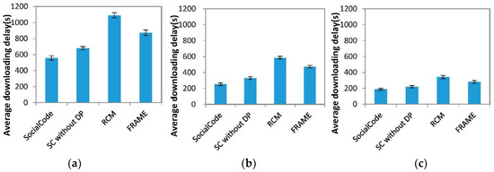 Average downloading delay vs. the number of nodes (a) 3468 nodes; (b) 867 nodes; (c) 216 nodes.