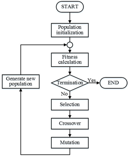 Figure 4 illustrates the fundamental procedure of GA. The evolution usually starts from a population of randomly generated individuals. In each generation, the fitness of every individual in the population is evaluated. The more fit individuals are stochastically selected from the current population, and each individual’s genome is modified by crossover and mutation operation to form a new generation. The new generation of candidate solutions is then used in the next iteration of the algorithm. When either a satisfactory fitness level has been reached, or a maximum number of generations have been produced, the algorithm terminates.