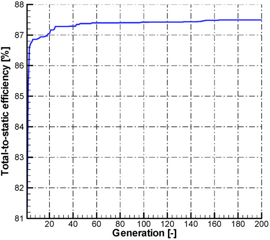 The T-100re optimization is obtained using the present GA assisted preliminary design procedure. The GA configuration has a population size of 15, an elite number of 1, a mutation rate of 0.15 and a maximum generation number of 200. The convergence curve of the total-to-static efficiency is shown in Figure 6 and the T-100re turbine has a total-to-static efficiency of 87.4%. It can be found that the convergent speed is quite fast and the design process costs only a few minutes. Some key parameters like rotor inlet radius and blade number, etc. can be easily optimized through the empirical correlations in the preliminary design optimization, but hard to be optimized in the later three-dimensional (3D) numerical optimization, which indicates that it is strongly necessary to perform an optimization at the preliminary design stage.