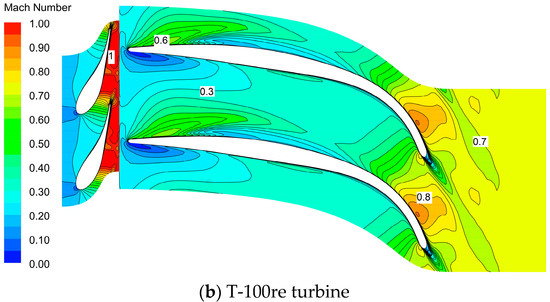 Figure 12 shows the comparison of Mach number contour between T-100 turbine and T-100re turbine at the mid-span section under design condition. At the outlet of the nozzle, the Mach number of T-100 turbine is lower than that of the T-100re turbine, while it is adverse at the outlet of the rotor. It is indicated that the enthalpy drop of T-100re turbine in the nozzle and the rotor is redistributed well, and the range of the lower Mach number in the rotor passage is reduced because of its higher rotational speed and reasonable rotor geometry. In addition, the absolute outlet velocity of T-100re turbine is 216.38 m/s, lower than that of T-100 turbine, 185.14m/s; thus, the total-to-static efficiency of the turbine is improved.