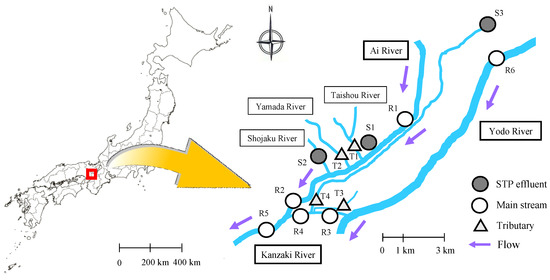 The question of primary importance is of how to select the sampling field to determine the distribution of pharmaceuticals in the environmental waters. For this purpose, considering the spreading out of the geographical region to core cities throughout Japan, the sampling areas in the Kansai district of Japan were selected; the locations were on the right bank of the middle-to-downstream region of the Yodo River [32] and on two other rivers, the Kanzaki and the Ai, and their tributaries. This area, known as the Kanzaki–Ai River basin, covers an important commercial and urban area of about 790 km2 in Osaka and Hyogo prefectures and is home to 2 million people [33,34].