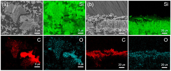 Surface characterization of rGO-SiNW sample. (a) Top view scanning electron microscope (SEM) image of reduced graphene oxide (rGO) on the silicon nanowire (SiNW) structure and corresponding Energy-dispersive X-ray Spectroscopy (EDS) elemental mapping describing the presence of Si, C, and O. (b) Cross-sectional SEM image of rGO on SiNW and corresponding EDS elemental mapping describing the presence of Si, C, and O.