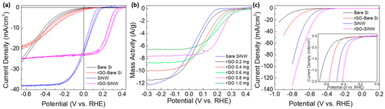 Photocurrent density-voltage characteristics of bare Si, SiNW and rGO-SiNW photocathodes. (a) Photo electrochemical responses for bare Si, SiNW, rGO functionalized SiNW and rGO-bare planar Si electrode. Different lines of the same color represent repeat measurements at the same condition. (b) Mass activity results according to the loading amount of rGO on SiNW. (c) Polarization curves for bare Si, rGO-bare Si, SiNW and rGO functionalized SiNW under dark condition.