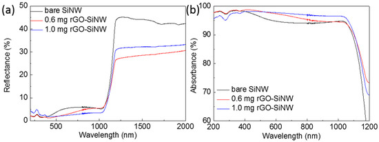 To gather more details on the optical reflection property of SiNW and rGO functionalized SiNW, we measured optical reflectance in the wavelength range of 200–2000 nm with SiNW as control. As displayed in Figure 3, when SiNW is fabricated on rGO-SiNW, the light reflectance is much lesser than compared to bare SiNW. The reflectance of rGO on SiNW and bare SiNW is almost 2% and 6% in the visible light region. This low reflectance can be attributed to the increased loading amount of rGO; thus, we believe that rGO absorbs a part of the incident light and reduces the absorption of light on the Si photoelectrode, which is followed by a decrease in current density with an increase in the loading amount of rGO. To clarify the absorption property, we also measured absorbance (Figure 3b) on applying the following equation [25]: