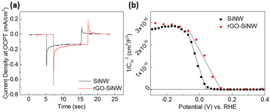 Electrochemical activity of SiNW and rGO-SiNW. (a) The transient curve of the photocurrent from SiNW and rGO-SiNW when the light was turned on and off at the open circuit potential region (OCPT). (b) Mott-Schottky plot from capacitance measurement.