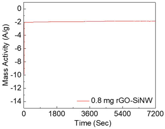 To sum up, the results of the capacitance and transient photoresponse measurements substantiate that the rGO-SiNW system is highly active in terms of decrease in recombination of charge carriers, and reduces the energy barrier for HER along the electrode/electrolyte interface. The long-term stability test of the 0.8 mg rGO-SiNW was implemented for 2 h at 0.25 V vs. RHE, showing a stable current density, as shown in Figure 6. The photocathode maintains a current density of approximately −2 A/g and more than 92% of the current, even after 2 h. Our stability testing result implies that the rGO co-catalyst efficiently suppresses the degradation of photoelectrochemical performance.