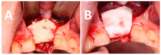 Clinical photographs of the procedure of a mandibular block bone graft for augmentation of an atrophic alveolar bone. (A) Fibrin glue was applied to the grafted bone, the block bone was secured with titanium miniscrew and the particulated bone was filled around the block bone. (B) collagen-based membranes (CBM) was used on the graft site after trimming of the grafted bone.