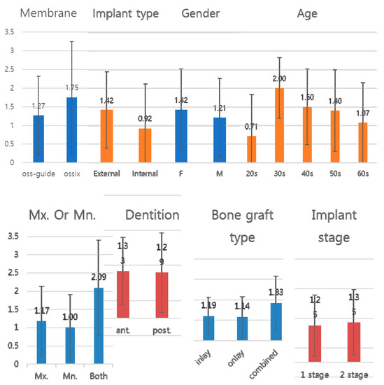 Graph of Table 1. The y-axis represents the number of implant threads exposed. The values of the y-axis are constant, and the numerical values of each factor can be easily compared. As a result of comparing with constant y-axis values, it can be seen that the number of implant thread exposures caused by various factors is not significantly different. Factors that cause a noticeable number of thread exposures are not observed.
