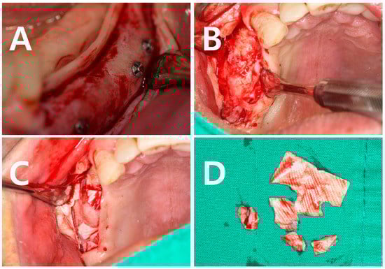 A clinical picture of augmented alveolar bone taken after a bone augmentation using a mandibular body block bone. After 4.982 ± 0.904 months, a flap was elevated for implant placement. (A) A clinical photo of the augmented bone with an elevated flap. (B) Using an NCLM (Bio-Guide), membrane no residue was observed in soft tissue after 4.982 ± 0.904 months. (C) Using CLM (Ossix), it is possible to observe the membrane that is not absorbed in the body but remains in the patient. (D) Remnants of separated CLM.