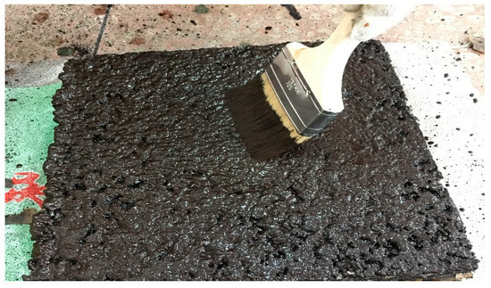 - The coating was then sprayed on the surface of the slab specimen according to the designated amount. The emulsified asphalt coating containing a certain amount of nano-TiO2 was uniformly painted onto the slab sample with a brush, as shown in Figure 3.
