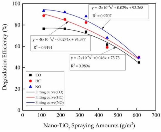 - The gas concentration in the degradation reaction chamber was recorded every 10 min. The test time was set to 90 min for every specimen. At least three specimens were prepared for each nano-TiO2 content or spraying amount of photocatalytic coating.