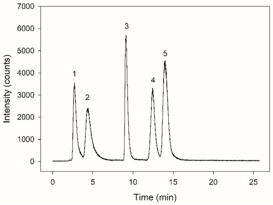 To identify selenium compounds in yeast extracts using the coupled HPLC-ICP-MS technique, five selenium standards were used: Se-methyl-SeCys, SeMet, , γ-glutamyl-Se-methyl-SeCys, and (Sigma-Aldrich, Munich, Germany). The chromatogram obtained for the selenium standards using the coupled HPLC-ICP-MS system is presented in Figure 1. To confirm the correctness of the selenium sample preparation, selenium-enriched yeast (SELM‒1), a certified reference material from the National Research Council Canada, was used for the analysis of its forms.