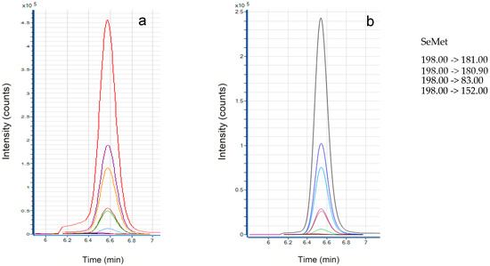 Chromatogram registered for extract of yeast C. utilis ATCC 9950 (transitions precursor ion → product ion) (a) and SELM−1 (selenium-enriched yeast certified reference material) (b) by UHPLC-ESI-QqQ-MS (the colors correspond to the intensity of the SeMet compounds, Supplementary Materials, Figure S8).