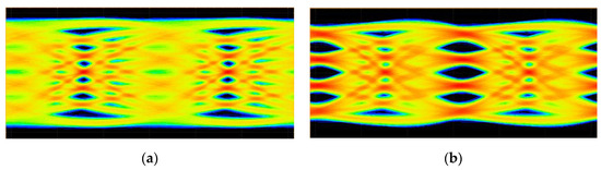 (a) Closed 4-level pulse amplitude modulation (PAM4) eye without pre-compensation, (b) open PAM4 eye with pre-compensation.