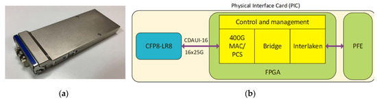 (a) Picture of 400GE CFP8-LR8 pluggable optical transceiver; (b) configuration of physical interface card (PIC). MAC: media access control, PCS: physical coding sublayer, FPGA: field programmable gate array, PFE: packet forwarding engine, CDAUI-16: 400G attachment unit interface, running at 16 lanes with 26.5625 Gb/s per lane.