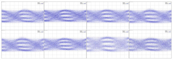 Optical eye diagrams of eight wavelength division multiplexing (WDM) channels using PAM4 modulation format. Top: channels 1 to 4; bottom: channels 5 to 8.