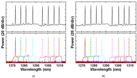 Optical spectra of two CFP8-LR8 modules: (a) first sample module; (b) second sample module. Top: spectrum at the output of the transmitter; Bottom: spectra of the individual lanes after going through a de-multiplexer.