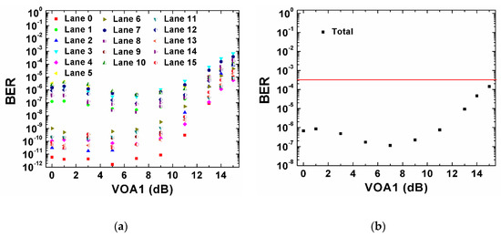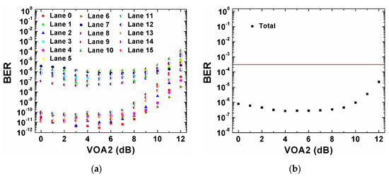 Back-to-back performance for interoperation of two CFP8-LR8 modules. The signal is transmitted from the Tx of the second module to the Rx of the first module: (a) BER versus VOA2’s attenuation for 16 individual electrical lanes; (b) total BER vs. VOA2’s attenuation. The threshold for UCW is shown as the red line.
