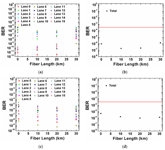 Interoperation of two CFP8-LR8 modules through single mode fiber (SMF) spool. The signal is transmitted from the Tx of the first module to the Rx of the second module: (a) BER vs. fiber length for 16 individual electrical lanes; (b) total BER vs. fiber length. The signal is transmitted from the Tx of the second module to the Rx of the first module: (c) BER versus VOA2’s attenuation for 16 individual electrical lanes; (d) total BER vs. VOA2’s attenuation. The threshold for the UCW is shown as the red line.