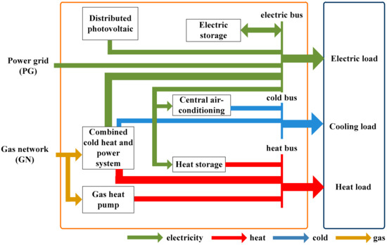 The multi-energy microgrid is an energy system that runs autonomously. The system consists of energy management devices, distributed renewable energy sources, energy storage devices, energy conversion devices, and energy loads; structurally, the microgrid is composed of energy input, conversion, and storage, as well as output components. In this study, a multi-energy microgrid was built based on the energy hub model, which consisting of a combined cold heat and power (CCHP) system, a gas heat pump (GHP), a distributed photovoltaic (PV), central air conditioning (CAC), electric storage (ES), and heat storage (HS) components with power, gas, cold, and heat energies. The structure of the multi-energy microgrid is shown in Figure 1.