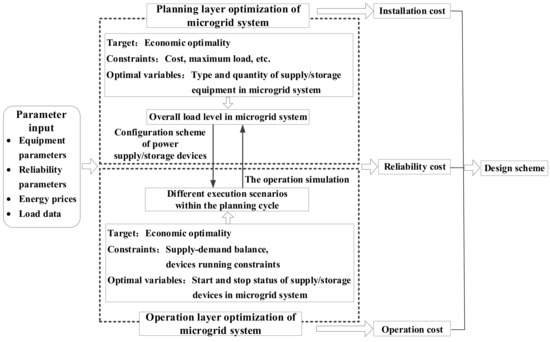 The optimized operation and scheduling level denotes the economic performance of the microgrid system under normal operation conditions. The economical efficiency converted by the energy supply reliability of the microgrid system is also calculated to determine the economic loss expectation produced under fault conditions and improve the economical indexes. This process is illustrated in Figure 2.