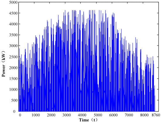 The gas network sets the fault rate and repair time of the main gas pipeline. Various factors correlated with power-generating efficiency are discussed here. The installed capacity of the PV is 4.6 MW; the annual output curve is shown in Figure 4. The optimization of different PV configurations is not discussed in subsequent planning programs. According to the local power pricing policy, the power price peaks at 11:00–15:00 and 19:00–21:00, and then valleys at 0:00–7:00; in other periods, the price remains stable. Table 4 lists the prices for different energy types. The loss value of electric/heating/cooling loads in the microgrid are 200 ¥/kW·h, 120 ¥/kW·h, and 120 ¥/kW·h, respectively. Self-sufficiency probability is 90%.