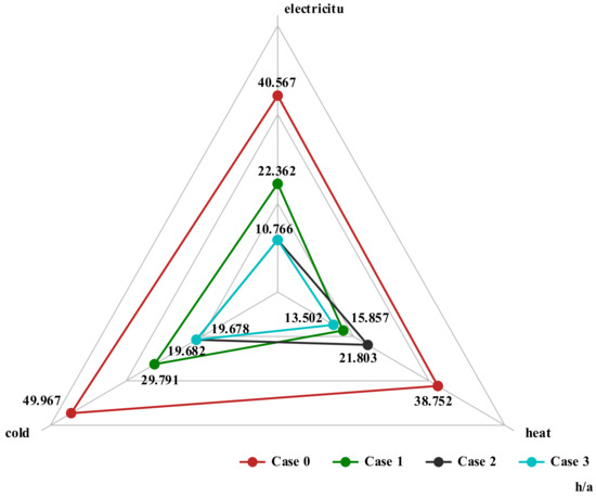 where and are the amount of natural gas that is needed for heating or refrigeration in the CCHP system; Qh and Qc are the heat or cold load to be satisfied by the CCHP system; is the operation efficiency of the CCHP for supplementary combustion, which is set as 75%; and Δth and Δtc are operation time of gas turbine in heating or cooling, respectively.