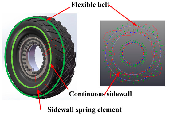 The radial stiffness of the tire sidewall is modeled with the radial spring (connecting the flexible belt ring and the continuous sidewall ring) and (connecting the continuous sidewall ring and the wheel). Additionally, the tangential stiffness of the tire sidewall is featured with the tangential spring (connecting the flexible belt ring and continuous sidewall ring) and (connecting the continuous sidewall ring and the tire wheel).