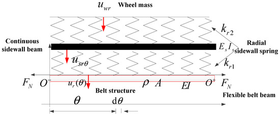 The schematic diagram of the flexible beam on an elastic continuous sidewall beam tire model is shown in Figure 2. The bending deformation of the flexile belt and the pre-tension axle force resulting from the inflation pressure was considered. Additionally, the sectional stiffness of the sidewall radial spring and the bending feature of the continuous sidewall beam were added to enrich the one-dimensional tire model. and are, respectively, the horizontal displacement of the flexible belt beam and the continuous sidewall beam at time at point ; and are, respectively, the bending stiffness of the flexible belt beam and the continuous sidewall beam; is the density per line of the belt beam and is the density per rad of the continuous sidewall beam; and are the radial stiffness of the sectional sidewall spring model; and are, respectively, the belt radii and sidewall ring radii; is the pre-tension force due to the inflating pressure and , where is inflation pressure; and is belt width.