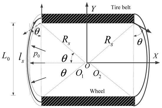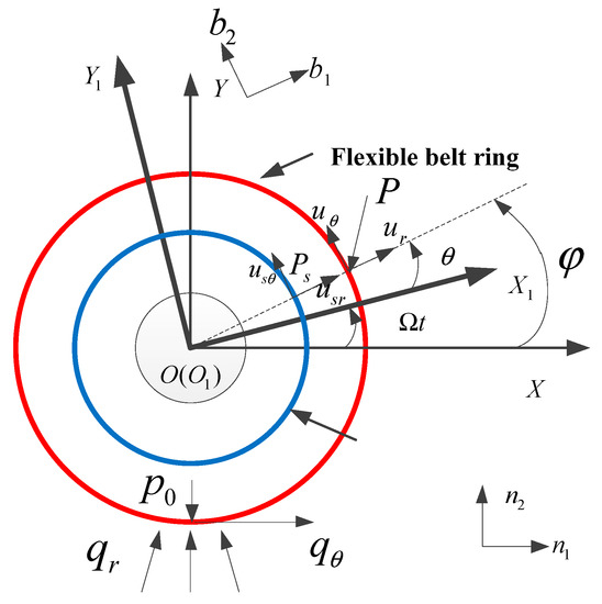 A polar coordinate system with the origin point located at the ring center is adapted to the theoretical model. Two polar coordinate systems, named as and , are defined and respectively refer to the polar coordinate system with a non-rotating (fixed) and a rotating coordinate origin frame in Figure 4. , are the arbitrary points of, respectively, the flexible belt and the continuous sidewall. , respectively refer to the tangential and radial deformation of at rotating coordinate , while , respectively refer to the tangential and radial deformation of at rotating coordinate .