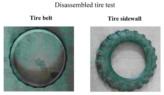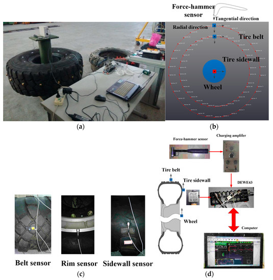 Vibration excitation is realized using a B&K hammer sensor (Naerum, Denmark), with the input force of the hammer sensor being measured by a force transducer. The PCB accelerometer sensors (PCB Piezotronics, Inc., Depew, NY, USA) are used to measure the resulting acceleration of the tire belt, the tire sidewall and the tire wheel illustrated in Figure 6c, in which the acceleration sensors are attached to the tire with a thin layer of mounting wax. Figure 6d presents the hardware system of the experimental modal analysis, in which by measuring the excitation force with the hammer sensor and the vibration response with the acceleration sensor, the input excitation force and output response acceleration are gathered using high-speed data acquisition equipment, namely a DEWE-43 (Austria).