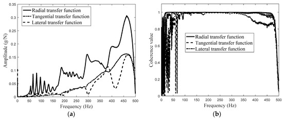 - The three-directional transfer function and coherence values for the excitation force and the response acceleration compared in Figure 7a show that the coherence value of the radial excitation force and the radial acceleration response have a difference of 1 for frequencies below 13 Hz. There is a similar difference of 1 between the coherence value for the radial excitation force and the tangential acceleration response for frequencies below 50 Hz. Beyond the above frequency band, the coherence value of the radial excitation force and the lateral acceleration response fluctuate around the frequency of 75 Hz; and