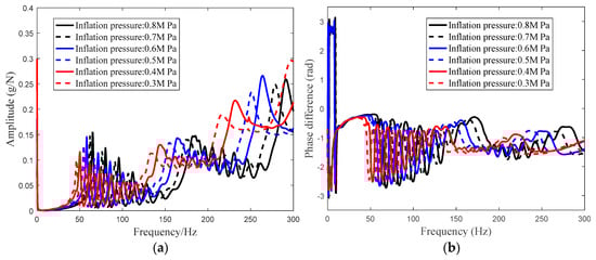 Planar acceleration transfer functions for a heavy load radial tire with a different inflation pressure: (a) Radial amplitude of the transfer functions; and (b) phase difference of the transfer function.