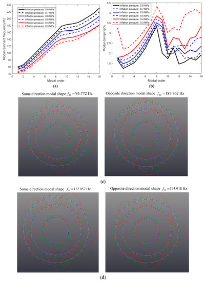 - The flexible ring on an elastic continuous foundation tire model with the stiffness variation of the sidewall spring model with inflation pressure can predict the modal frequency of the tires with a different inflation pressure, and the prediction errors of the planar modal frequency of the tires with a different inflation pressure are limited within 3% (inflation pressure: 0.7, 0.6, 0.5, and 0.4 MPa) and 6% (0.3 MPa).
