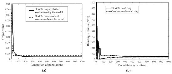 - The steady object value of identification procedure utilizing the flexible ring on an elastic continuous sidewall ring tire model is compared with that utilizing the flexible beam on an elastic continuous sidewall beam model in Figure 13a. The compared identification procedure implies that the model prediction error using flexible ring on an elastic continuous sidewall ring tire model is less than that utilizing the flexible beam on an elastic continuous sidewall beam model resulting from taking the coupling feature between the radial and tangential deformation of flexible belt ring and continuous sidewall ring into consideration;