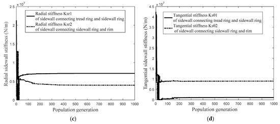 - The structural parameters, including: bending stiffness ,, and sidewall stiffness , , and , converge to the optimum solution as the optimization procedure proceeding 400 generations;