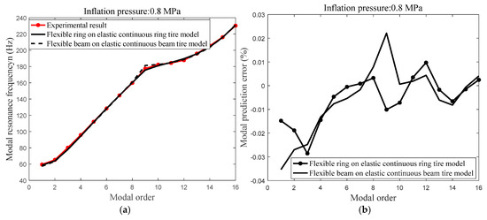 Figure 14. Modal prediction with the identified structural parameters; (a) the compared modal resonance frequency between the experimental modal resonance frequency, predicted modal resonance frequency utilizing the flexible ring on an elastic continuous sidewall ring tire model and predicted modal resonance frequency utilizing flexible beam on an elastic continuous sidewall beam tire model; and (b) the compared modal prediction error between predicted modal resonance frequency utilizing the flexible ring on an elastic continuous sidewall ring tire model and predicted modal resonance frequency utilizing flexible beam on an elastic continuous sidewall beam tire model.