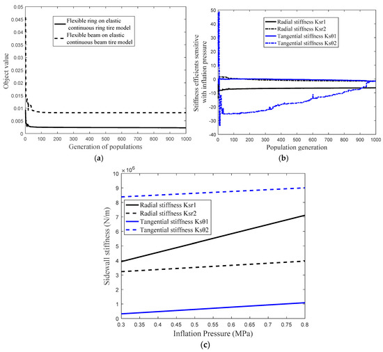 Figure 16a presents the compared object value of flexible ring on an elastic continuous foundation tire model and flexible beam on an elastic continuous sidewall beam tire model. Additionally, Figure 16b shows the stiffness coefficients of the sidewall spring model of the identification procedure and the Figure 16c illustrates the radial and tangential stiffness of the sidewall spring model with a different inflation pressure.