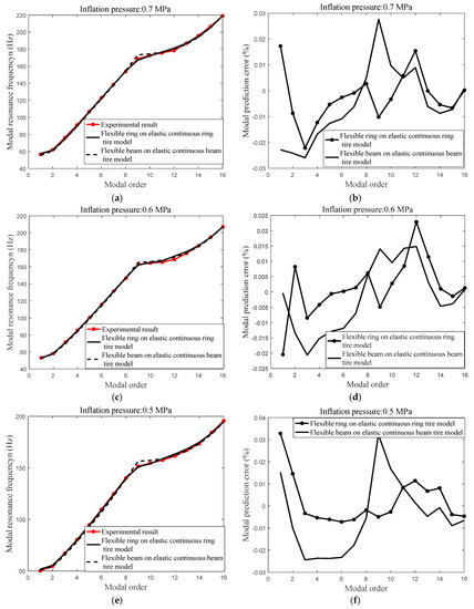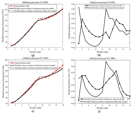 Compared modal resonance frequency between the experimental modal resonance frequency, the predicted modal resonance frequency utilizing the flexible ring on an elastic continuous foundation tire model and predicted the modal resonance frequency utilizing flexible beam on an elastic continuous sidewall beam tire model; (a) vibration modal prediction of the flexible ring on an elastic continuous foundation tire model with inflation pressure: 0.7 MPa; (b) modal prediction error with inflation pressure: 0.7 MPa; (c) vibration modal prediction of the flexible ring on an elastic continuous foundation tire model with inflation pressure: 0.6 MPa; (d) modal prediction error with inflation pressure: 0.6 MPa; (e) vibration modal prediction of the flexible ring on an elastic continuous foundation tire model with inflation pressure: 0.5 MPa; (f) modal prediction error with inflation pressure: 0.5 MPa; (g) vibration modal prediction of the flexible ring on an elastic continuous foundation tire model with inflation pressure: 0.4 MPa; (h) modal prediction error with inflation pressure: 0.4 MPa; (i) vibration modal prediction of the flexible ring on an elastic continuous foundation tire model with inflation pressure: 0.3 MPa; and (j) modal prediction error with inflation pressure: 0.3 MPa; .