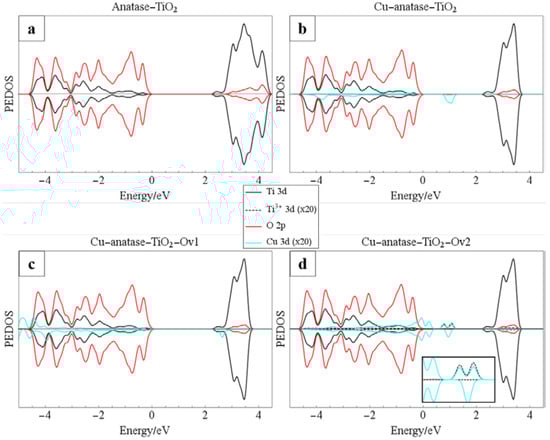 Projected electronic density of states (PEDOS) plots for (a) undoped anatase, (b) Cu-doped anatase with no oxygen vacancies and (c) after formation of a single, charge compensating oxygen vacancy and (d) after formation of a second, reducing oxygen vacancy.
