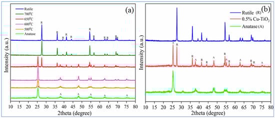 XRD is utilized to study the impact of Cu doping on the anatase to rutile phase transition of TiO2 at various calcination temperatures. Figure 4a shows the XRD profiles of pure anatase TiO2 and 0.5% Cu-TiO2 (calcined at 500 °C, 600 °C, 650 °C and 700 °C). XRD spectrum of rutile TiO2 is also provided for reference. The spectra of undoped samples of TiO2 for all the given temperatures are given in Figure S1. The anatase and rutile peak intensities are generally observed at 25.4° and 27.3°, respectively, (101 and 110) [15]. These values were used to calculate the percentage of anatase and rutile of TiO2 in all samples using the Spurr equation (Equation (2)). Cu-TiO2 at 500 °C and 600 °C exhibited 100% of anatase while the sample at 700 °C showed 100% of rutile. Interestingly, calcined at 650 °C yielded a mixture phase constituting 55% of anatase and 45% of rutile TiO2 (Figure 4b).