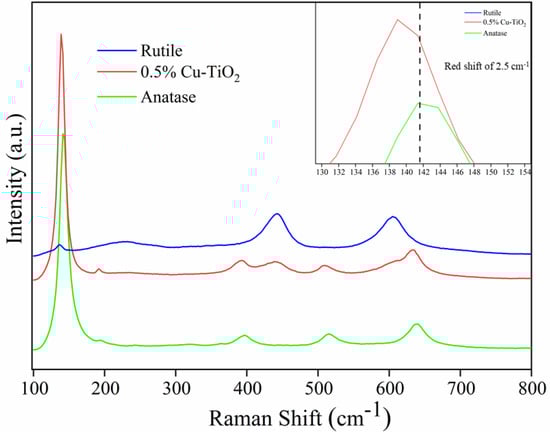 The anatase-to-rutile transition of Cu-TiO2 was further examined using Raman spectroscopy. A typical Raman spectrum shows characteristic modes at different wavenumbers, corresponding to Raman shifts. The active modes for anatase are A1g, 2B1g and 3Eg at 147, 197, 396, 516 and 638 cm−1 respectively. For rutile, the Raman active modes are A1g, B1g, B2g and 3Eg at 144, 238, 446 and 612 cm−1 [15]. Raman spectra displayed the presence of the titania peaks and did not exhibit the occurrence of copper/copper oxides or other impurities (Figure 5). The Raman results are consistent with the data observed in XRD analysis. The anatase phase of titania is retained well by the Cu doping. Similar results were also observed for higher concentration (<0.5 mol %) of Cu-doped samples [71,72,73]. However, as observed in the figure below, the doped sample shows a small decrease in frequency of 2.35 cm−1 (red shift as illustrated in the inset of the image). Decrease in frequency is the resultant of the Cu insertion in the TiO2 lattice, which subsequently weakens the bond between the O-Ti-O bond, therefore leading to a higher lattice constant.