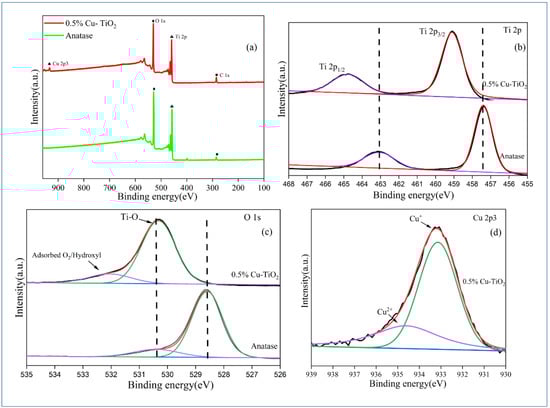 The X-ray Photoelectron Spectroscopy (XPS) quantifications were performed to analyze the elemental composition of anatase TiO2 and Cu-doped samples. Figure 6a provides the survey spectrum of anatase TiO2 and 0.5% Cu-doped TiO2 calcined at 650 °C. It illustrates the presence of titanium, oxygen and additionally copper for the doped sample. A small amount of carbon peak also emerged, which is acquired during the synthesis and calcination processes. An introduction of Cu into TiO2 lattice resulted in substitution of Ti4+ by the Cu2+ ion [74]. Hence, instead of O-Ti-O bonds new bonds of Cu-O are established. Figure 6b provides the high-resolution spectra of Ti 2p, which exhibits very sharp, symmetric and intense peaks, indicating the presence of Ti+4 state. The deconvoluted Ti 2p peaks of anatase appears at 457.4 eV and 463.06 eV, which is ascribed to Ti 2p3/2 and Ti 2p1/2 (Ti-O bond) respectively. In the case of Cu-TiO2 650 °C, a significant shift of around 1.7 eV is observed for both Ti 2p3/2 and Ti 2p1/2 (459.06 eV and 464.83 eV) [75,76]. The shift in the peak is attributed to the introduction of Cu in the lattice. The Ti 2p peaks of Cu-TiO2 650 °C do not show any indication of Ti3+ or Ti2+ states. Similarly, Figure 6c illustrates the high-resolution spectra of O 1s, where peaks at 528.59 eV constitutes to the crystal lattice oxygen (O-Ti4+) and 530.40 eV for adsorbed hydroxyl or oxygen molecules. Whilst the O 1s spectrum of the doped sample showed a similar shift as observed for Ti 2p spectrum attributed to the introduction of copper atom in the lattice [77]. The Cu 2p3 spectrum (Figure 6d) on deconvolution exhibits an intense peak at 933.13 eV and a shorter peak at 934.60 eV, ascribed to Cu+ and Cu2+ states [75].