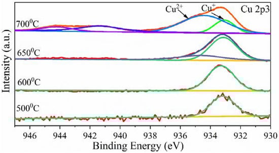 Figure 7 illustrates the high-resolution spectra of 0.5% Cu-TiO2 samples calcined at different temperatures. It is observed that with increase in temperature from 500 °C to 700 °C the Cu+ state observed at 933.1 eV gradually decreases. While the Cu2+ state at 934.3 eV is only observed at 650 °C and 700 °C. Additionally, two satellite peaks of Cu2+ were also observed at 941.3 eV and 944.2 eV for 700 °C [75,78]. The intensity of the peak at 934.3 eV gradually increases with the increase in calcination temperature [75,79]. Usually, the TiO2 exhibits stable anatase phase in the range of 500–600 °C and converts to rutile with increase in temperature. However, the change in oxidation states with increase in calcination temperature in our Cu-doped samples (change in oxygen vacancies) contributes to the high temperature stability of the oxygen-rich anatase phase at 650 °C [23,34].