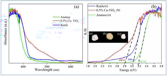 The electronic band structures of the as-prepared samples were analyzed by UV–Vis absorption (Figure 8). The pristine TiO2 at anatase phase shows an intense absorption in the Ultra-Violet region (around 350 nm). While the rutile sample exhibits at 380 nm, on the other hand the Cu-doped sample indicated a red shift extending up to 600 nm. This is attributed to the characteristic surface plasmon resonance of Cu nanoparticles. The successful doping of Cu is also evident from the change in the color observed in the samples, shifting from pure white to light yellow (as shown in the inset of Figure 8b). The band gap value of the samples was estimated using the Kubelka–Munk equation (Equation (4)) [51]. The band gap values of pristine TiO2 at anatase and rutile phases were observed to be 3.17 eV and 3.03 eV, respectively. The Cu-doped sample showed a significant dip in the band gap value up to 2.8 eV.